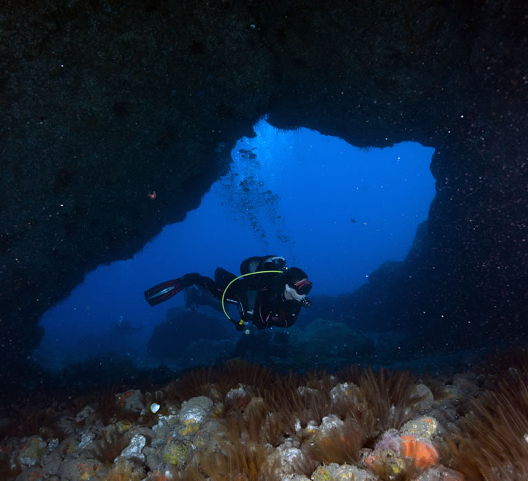 Denne typen dykking regnes ikke som teknisk dykking, og kan gjøres av vanlige sportsdykkere. Det krever ikke spesielt utstyr eller sertifisering, og er for mange den første smaken på grottedykking. Caverndykking er populært blant undervannsfotografer fordi det ofte gir fantastiske muligheter til å fange lyset.