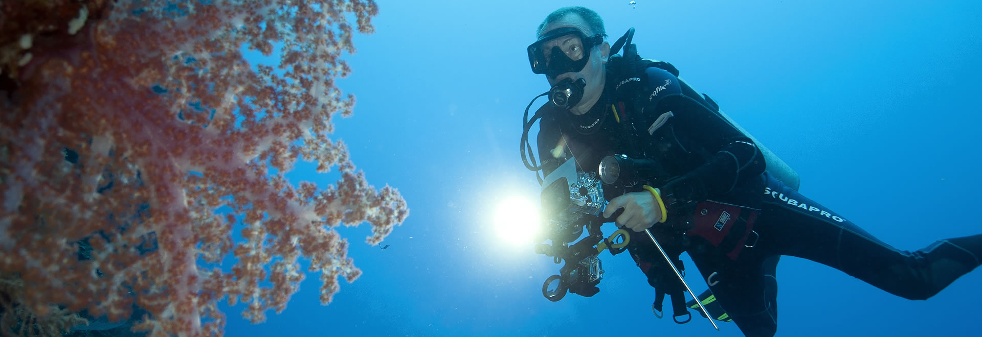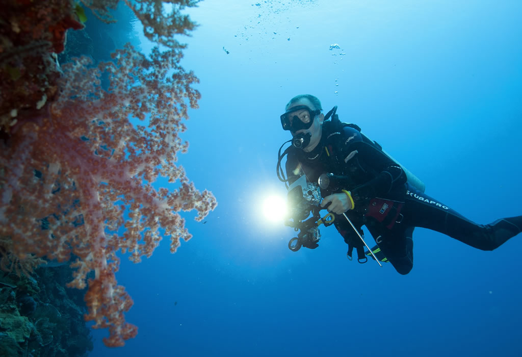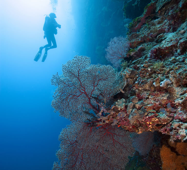Det er en helt egen følelse å sveve vektløs langs en bratt vegg som forsvinner ned i det mørke dypet under deg. Langt der opp kan du se overflaten, og veggen er full av fargerike bløtkoraller, enorme korallvifter, digre svamper og et yrende dyreliv.