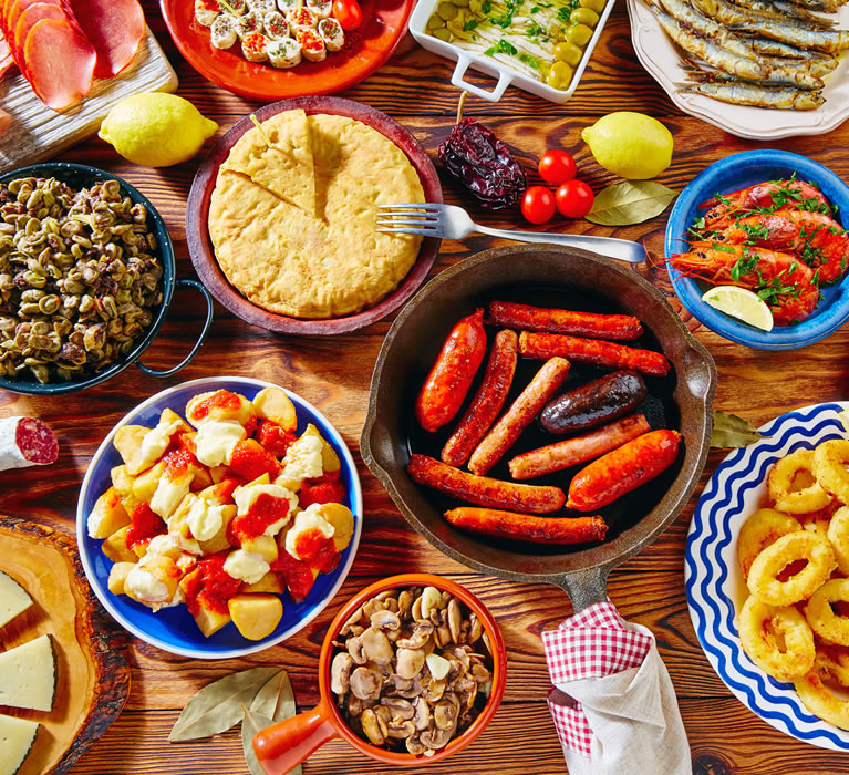 Vin og god mat er nasjonal lidenskap i Spania og det med god grunn. Spansk matlaging bygger på nøkkelprinsippene; stor variasjon, tradisjonelle oppskrifter overlevert gjennom generasjonene og en medfødt vilje til å eksperimentere og se hva som kommer ut av kjøkkenlaboratoriet. Du kan oppleve det beste måltidet noensinne med tapas i en bar hvor alle roper for å kommunisere eller med et måltid tilberedt av en kjendiskokk i omgivelsene til en Michelin-restaurant. Uansett hvor du velger å spise, så venter det en fantastisk bredde av gastronomiske opplevelser på deg.